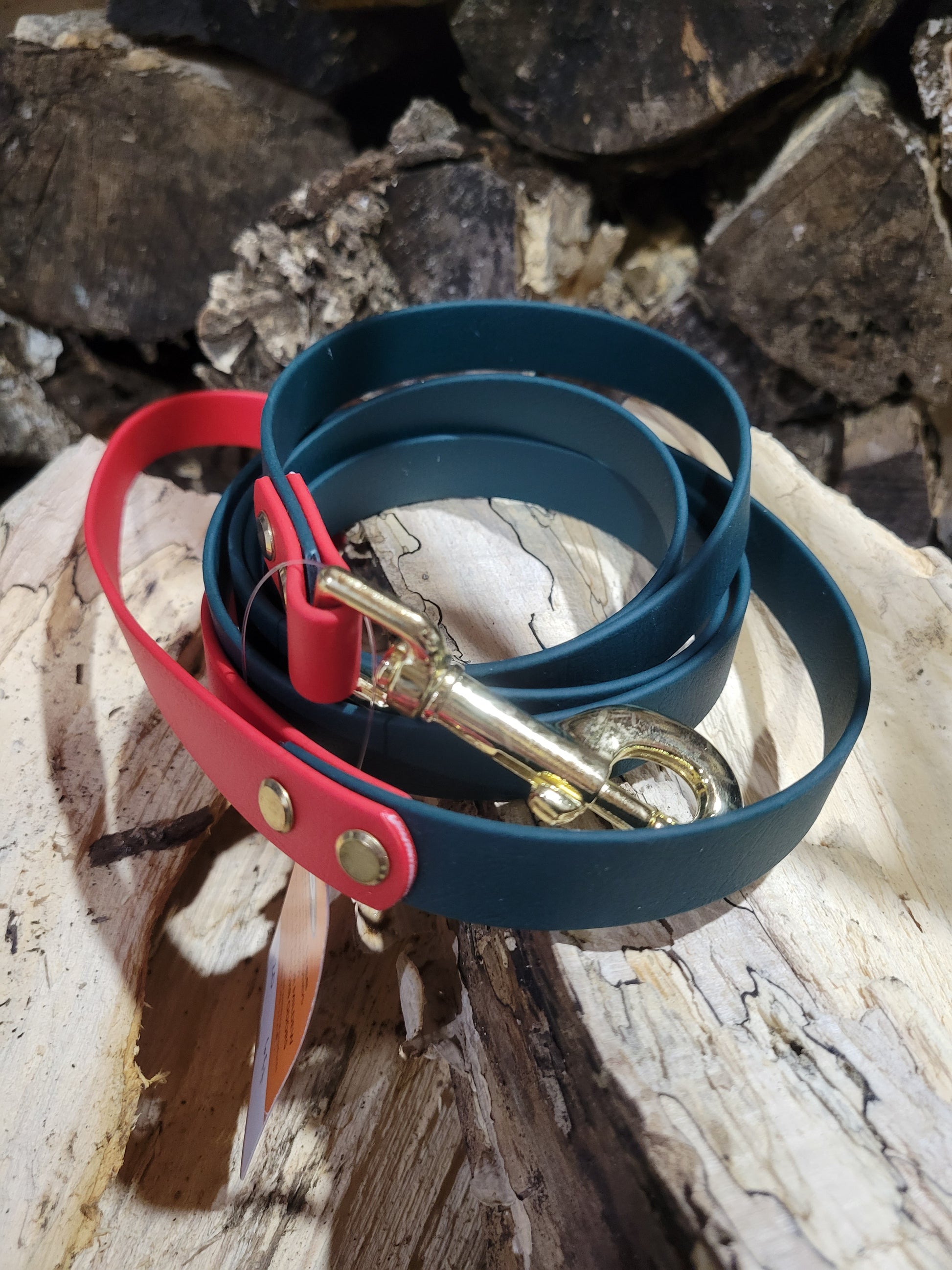 Red and dark green BioThane®️ with gold hardware, 6ft