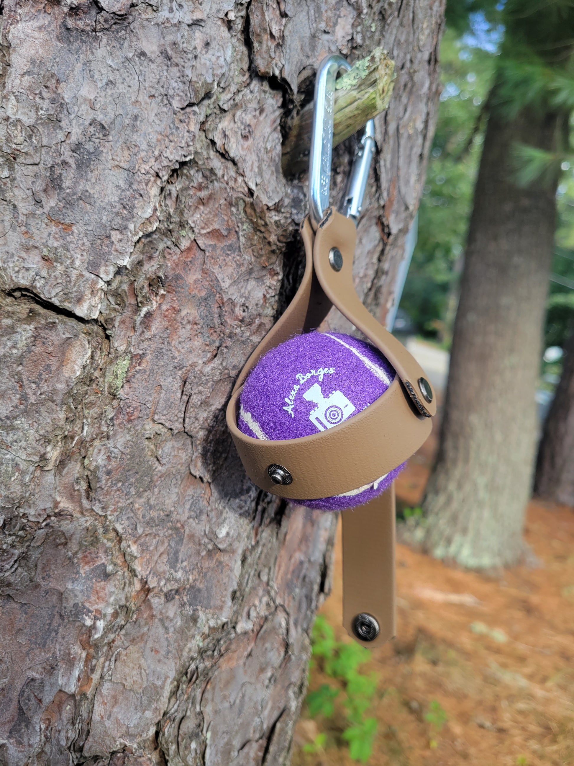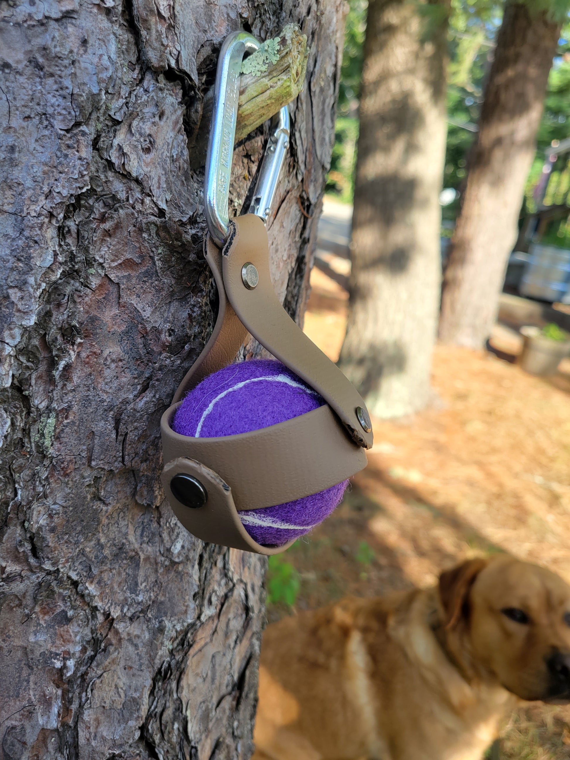 Biothane ball holder: you can clip it to yourself or your bag during your adventures! Quick release button gives you easy access to your ball so you and your pal play. Fits a standard tennis ball sized ball. Ball included in purchase.
