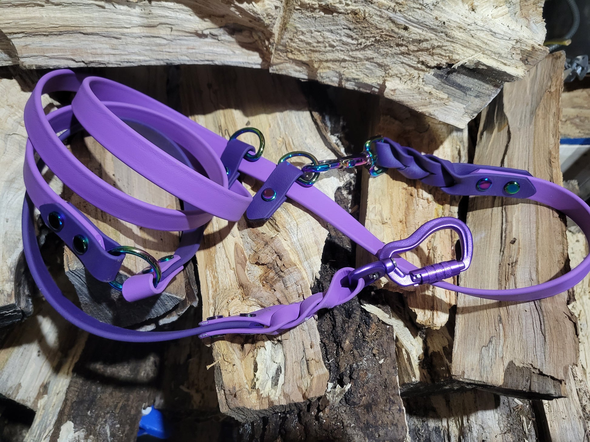 This pre-made hands free leash is made with Orchid and Dark Purple BioThane®️, it has an upgraded carabiner clip & braid add on.