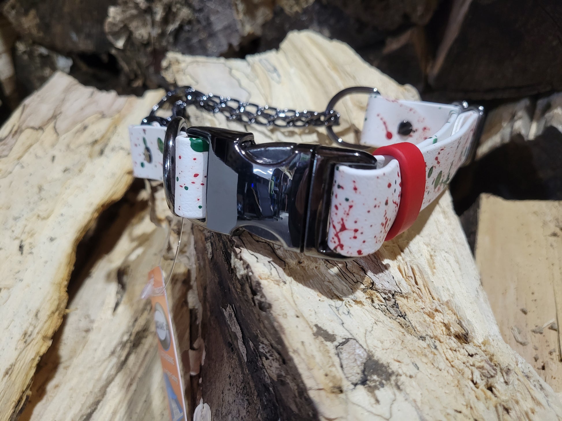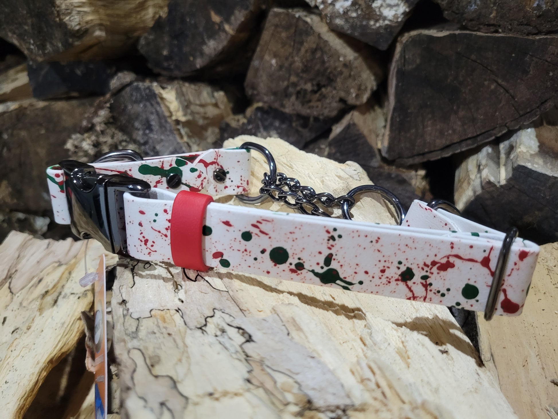 Green and red splatter on white BioThane®️ and gunmetal hardware martingale collar. Fits neck size 17.5"-21"